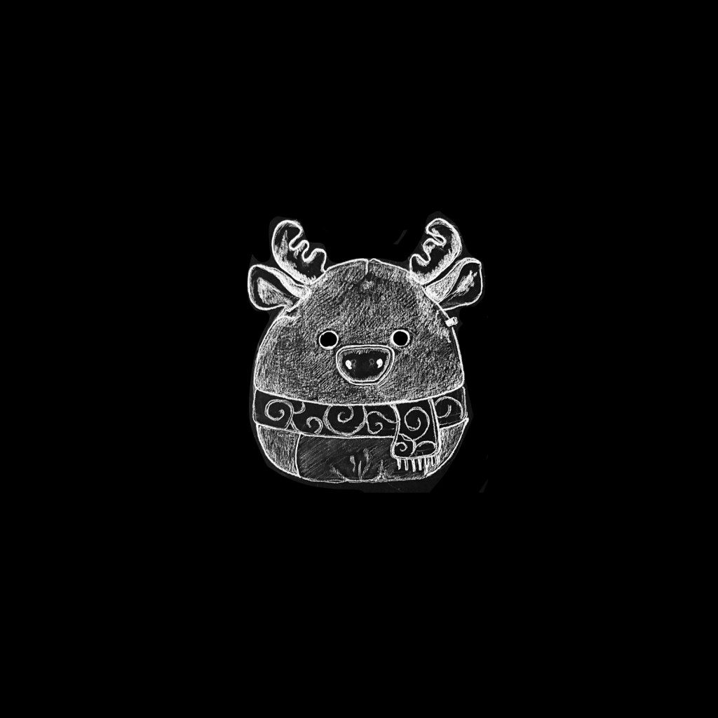 I can’t believe it has taken me 150 days to add a Squishmallow to the blog. We are bursting at the seams with Squishmallows (thank you 5 Below). This is “Markina” and she is a lavender moose from the Christmas collection and she sports a lovely scarf with scrollwork detailing. Her antlers are made of a glitter fabric that I sadly could not capture with my pencil. And I have to confess, she is digitally altered.